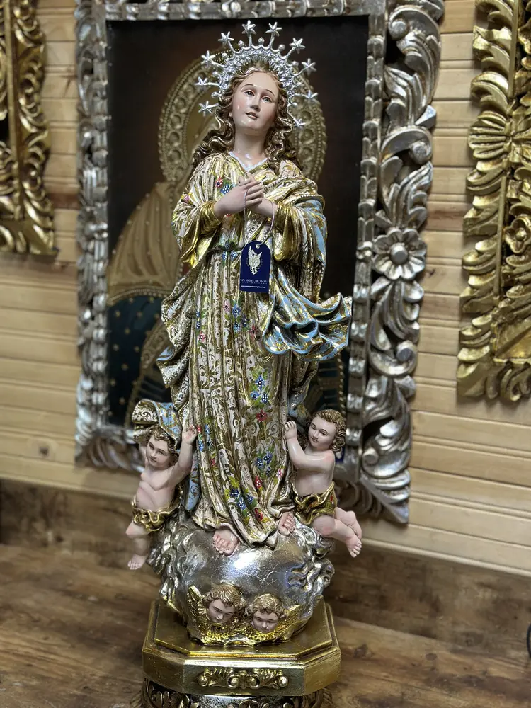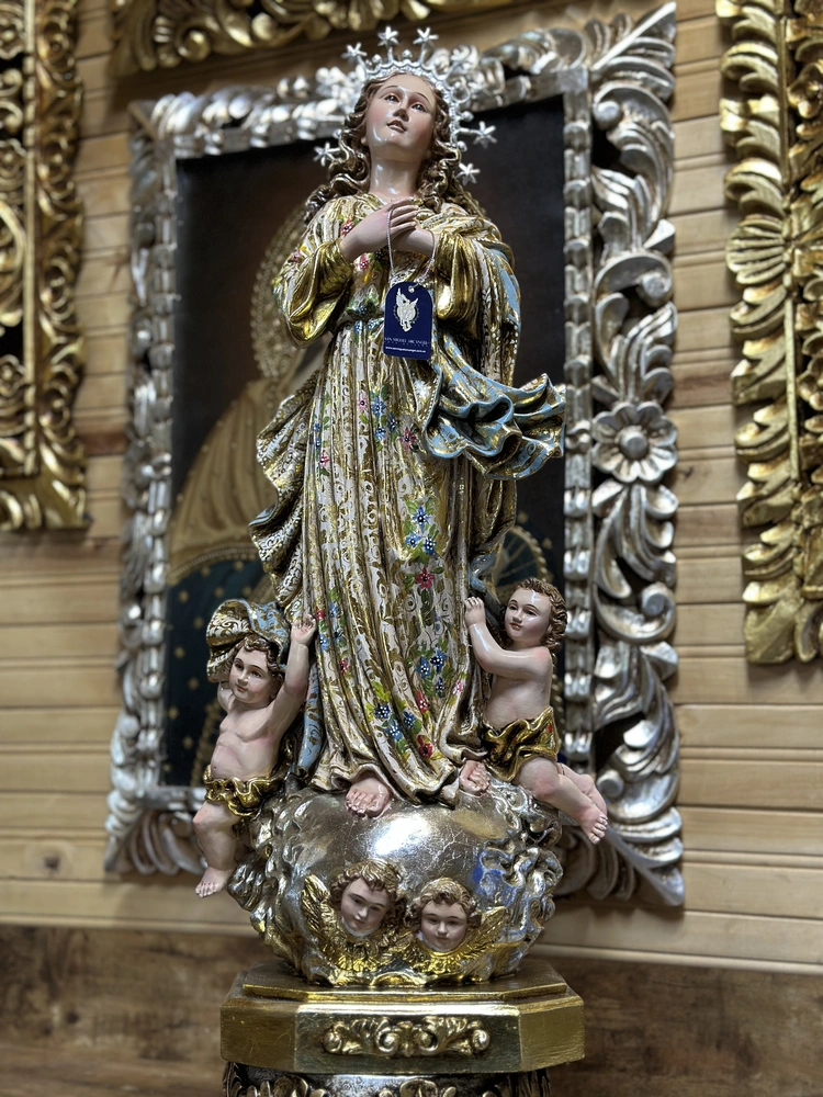 Esta exquisita imagen de 60 cm de alto es una auténtica representación del arte barroco colonial americano, siendo una talla en madera fiel a la tradición de la Escuela Quiteña (siglos XVII-XVIII). Esta es una Obra de Arte Única, fruto de un meticuloso y dedicado trabajo artístico manual. Cada curva de la talla, cada pincelada de color y cada detalle ha sido ejecutado por artesanos calificados que preservan las técnicas ancestrales de la Escuela Quiteña. El resultado, una escultura con un alma propia, donde la impronta de la mano del artista garantiza su exclusividad.