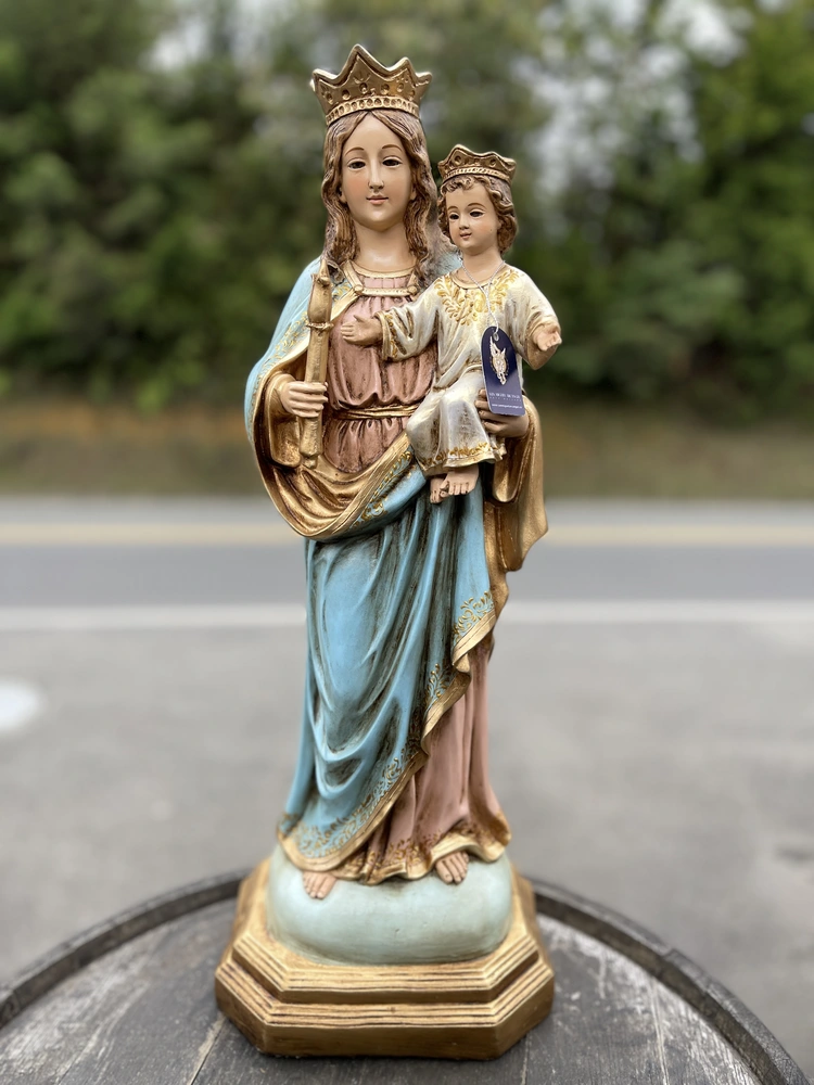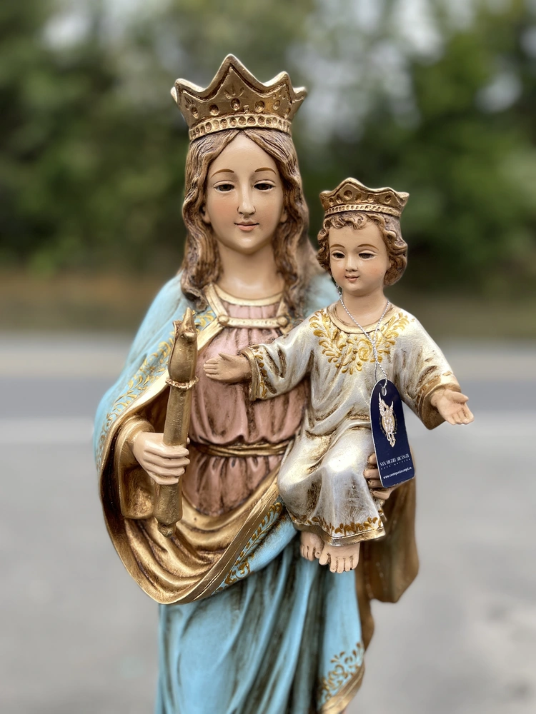 Esta representación clásica exalta a María como Reina y Madre de la Iglesia, e incluye elementos esenciales de su iconografía: la Corona, que simboliza su realeza; y el Niño Jesús en brazos, quien representa la Maternidad Divina. María sostiene un Cetro en su mano derecha, símbolo de su poder y autoridad como Reina de todo lo creado.
