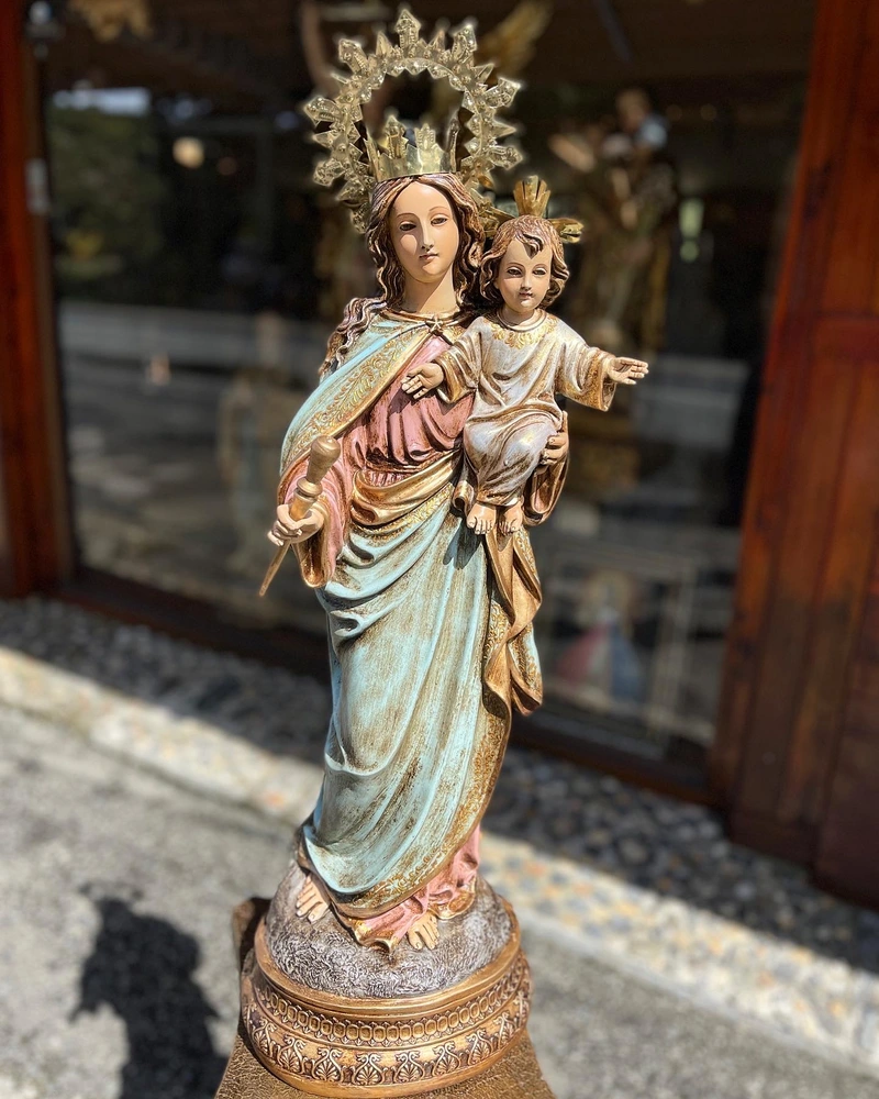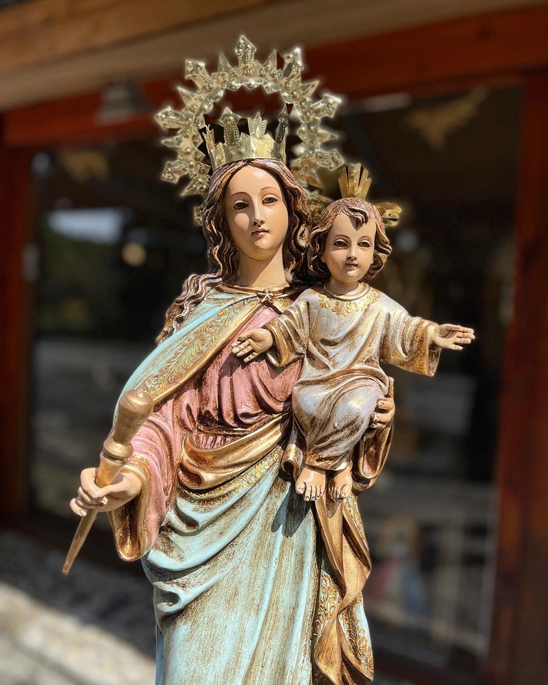 María Auxiliadora, cuyo nombre completo es María Auxilio de los Cristianos, es una advocación con un origen que se remonta a los primeros siglos del cristianismo y que se consolidó como pilar de la espiritualidad salesiana impulsada por San Juan Bosco. Esta imponente imagen de 70 cm, elaborada en fibra de vidrio de alta calidad, destaca por sus delicados detalles y ligereza. El diseño se basa en la iconografía clásica turinesa, con un acabado en tonos tradicionales y profundos: la túnica rosada, que simboliza el amor maternal y la caridad; y el manto azul-celeste, que representa el Cielo y la protección divina que ella extiende sobre la Iglesia. Esta paleta de colores confiere a la pieza una majestuosidad atemporal y solemne, haciendo de ella un tesoro de fe y auxilio.