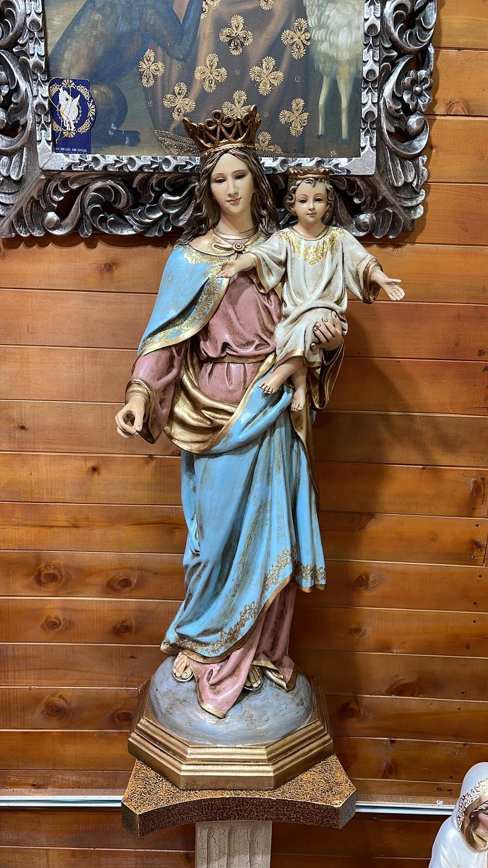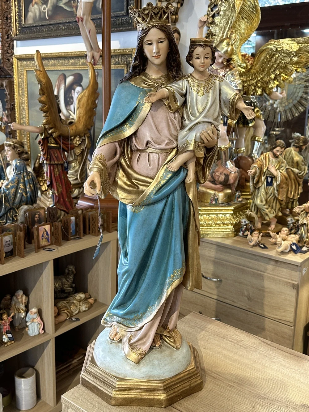 María Auxiliadora, cuyo nombre completo es María Auxilio de los Cristianos, es una advocación con un origen que se remonta a los primeros siglos del cristianismo y que se consolidó como pilar de la espiritualidad salesiana impulsada por San Juan Bosco. Esta imponente imagen de 80 cm, elaborada en fibra de vidrio de alta calidad, destaca por sus delicados detalles y ligereza. El diseño se basa en la iconografía clásica turinesa, con un acabado en tonos tradicionales y profundos: la túnica rosada, que simboliza el amor maternal y la caridad; y el manto azul-celeste, que representa el Cielo y la protección divina que ella extiende sobre la Iglesia. Esta paleta de colores confiere a la pieza una majestuosidad atemporal y solemne, haciendo de ella un tesoro de fe y auxilio.