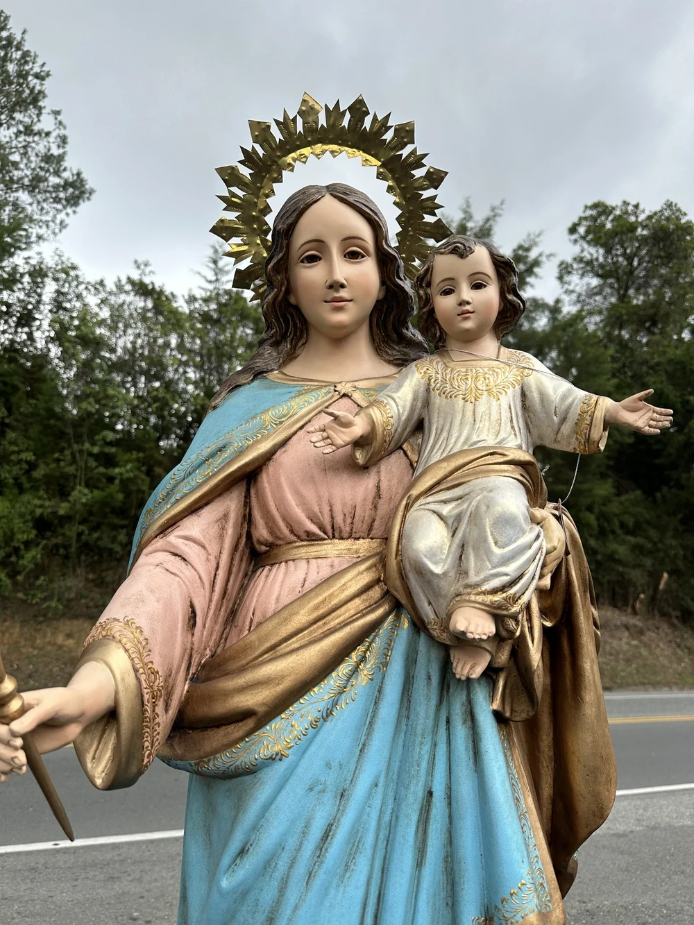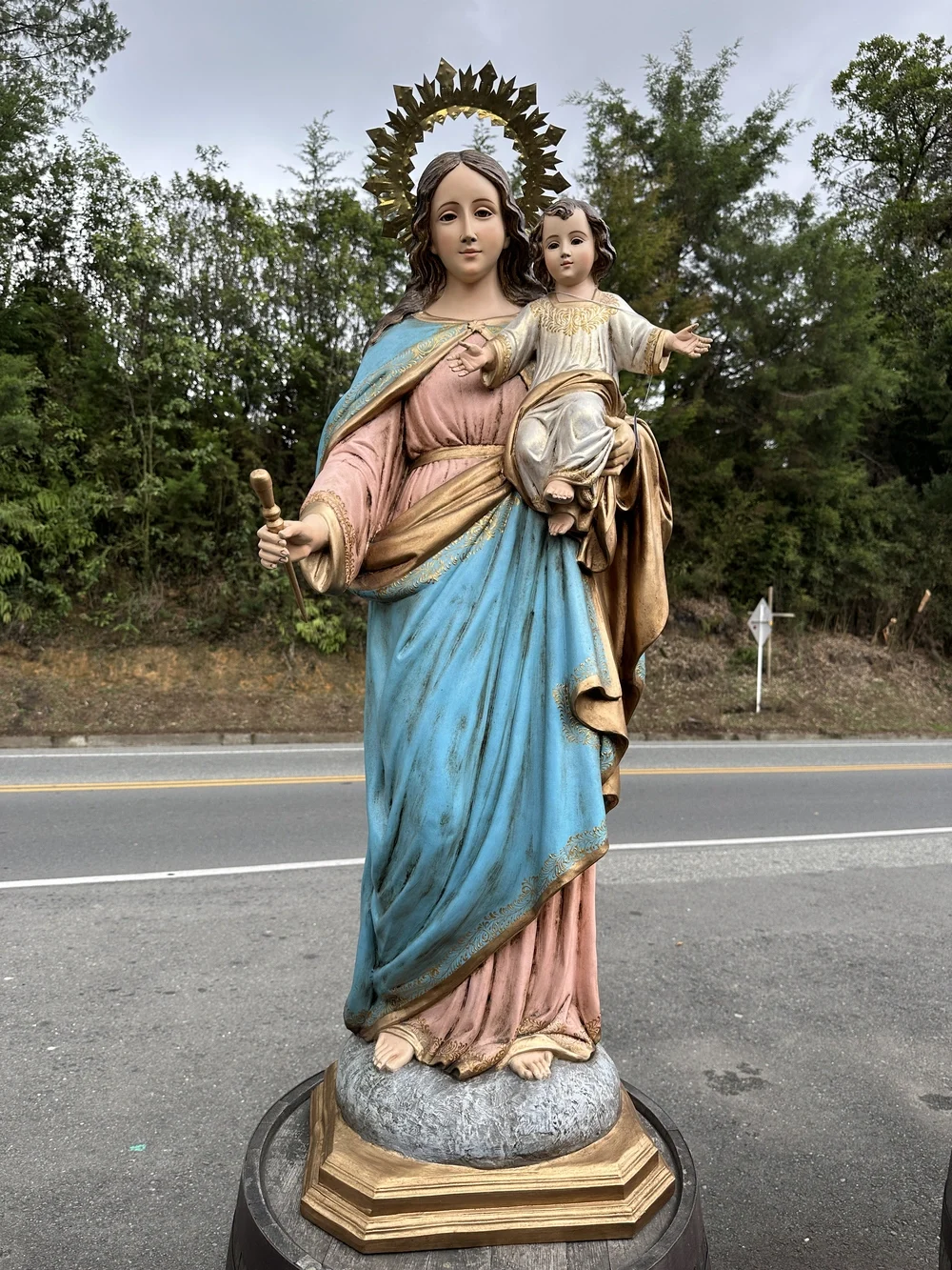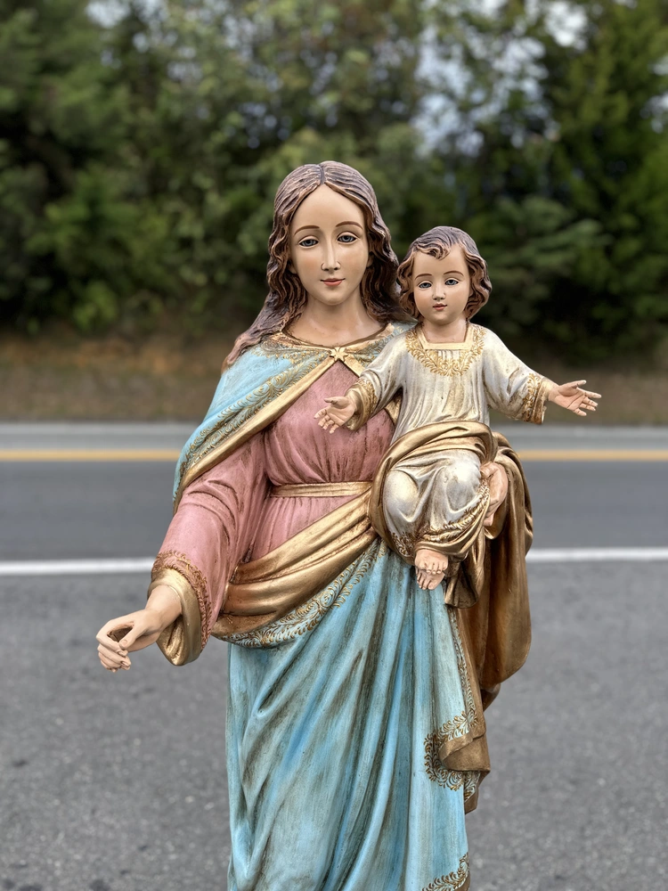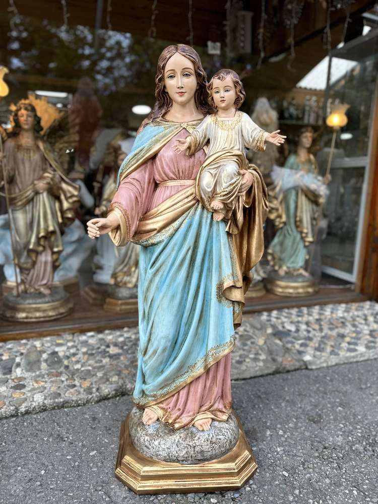 María Auxiliadora, cuyo nombre completo es María Auxilio de los Cristianos, es una advocación con un origen que se remonta a los primeros siglos del cristianismo y que se consolidó como pilar de la espiritualidad salesiana impulsada por San Juan Bosco. Esta imponente imagen es elaborada en fibra de vidrio de alta calidad, destaca por sus delicados detalles y ligereza. El diseño se basa en la iconografía clásica turinesa, con un acabado en tonos tradicionales y profundos: la túnica rosada, que simboliza el amor maternal y la caridad; y el manto azul-celeste, que representa el Cielo y la protección divina que ella extiende sobre la Iglesia. Esta paleta de colores confiere a la pieza una majestuosidad atemporal y solemne, haciendo de ella un tesoro de fe y auxilio.