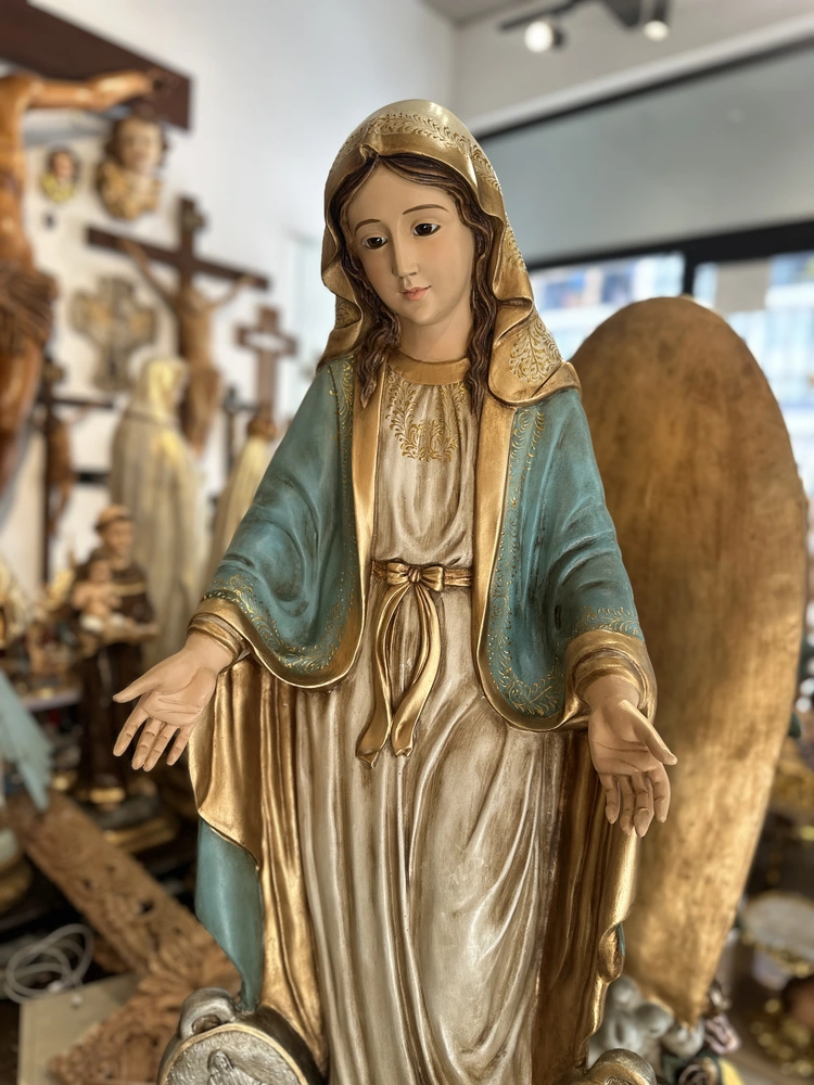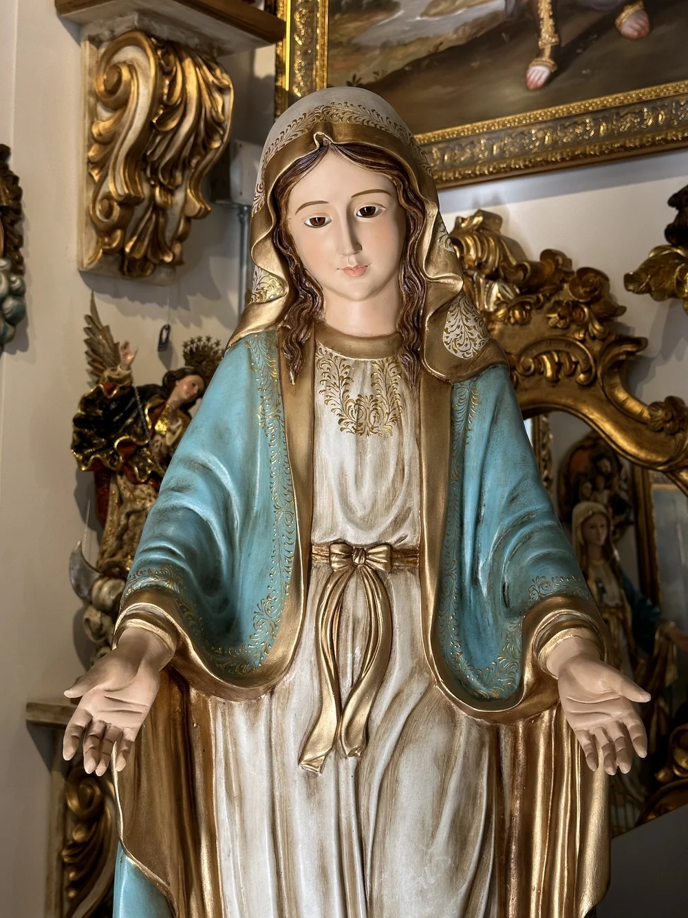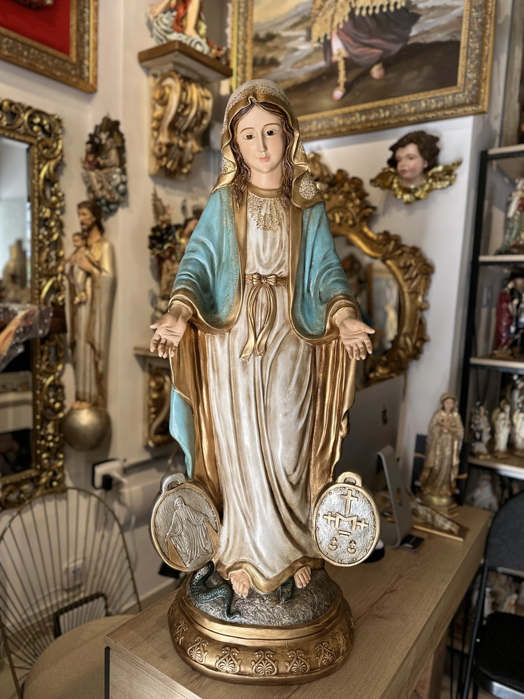 Nuestra Señora de la Medalla Milagrosa, Madre de la Gracia y Auxilio de los cristianos. Esta conmovedora imagen de 110 cm, elaborada en fibra de vidrio de alta calidad, destaca por sus delicados detalles y ligereza. El diseño presenta un acabado con tonos tradicionales y suaves, fiel a la aparición a Santa Catalina Labouré: el manto azul que simboliza el cielo, la verdad y la fidelidad, y la túnica blanca que representa la pureza, la inocencia y la Inmaculada Concepción. Esta paleta de colores confiere a la pieza una dulzura atemporal y profunda, haciendo de ella un tesoro de fe y esperanza.