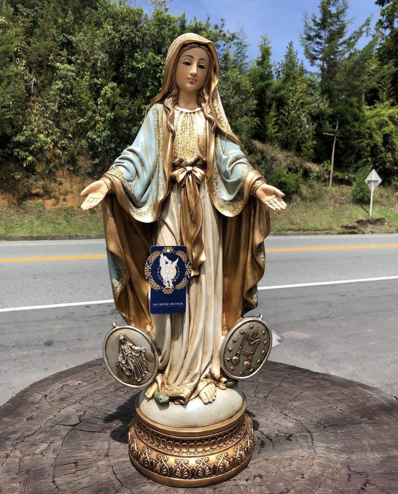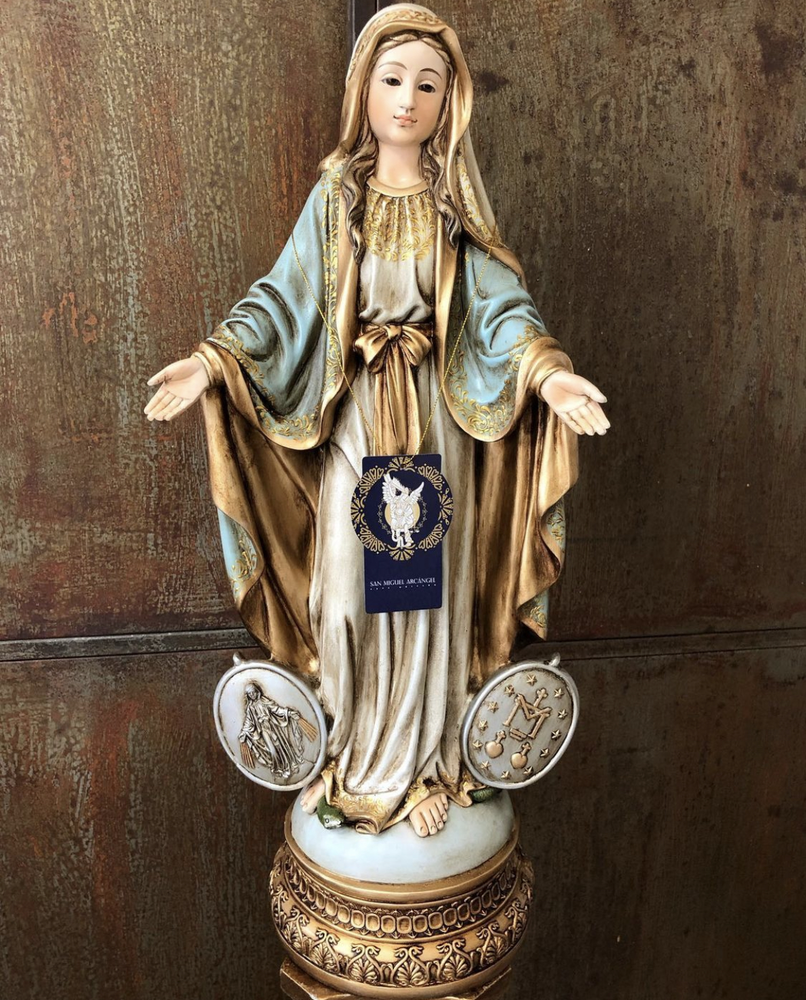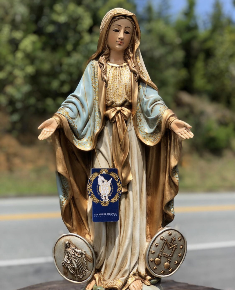 Nuestra Señora de la Medalla Milagrosa, Madre de la Gracia y Auxilio de los cristianos. Esta conmovedora imagen de 60 cm, elaborada en fibra de vidrio de alta calidad, destaca por sus delicados detalles y ligereza. El diseño presenta un acabado con tonos tradicionales y suaves, fiel a la aparición a Santa Catalina Labouré: el manto azul que simboliza el cielo, la verdad y la fidelidad, y la túnica blanca que representa la pureza, la inocencia y la Inmaculada Concepción. Esta paleta de colores confiere a la pieza una dulzura atemporal y profunda, haciendo de ella un tesoro de fe y esperanza.